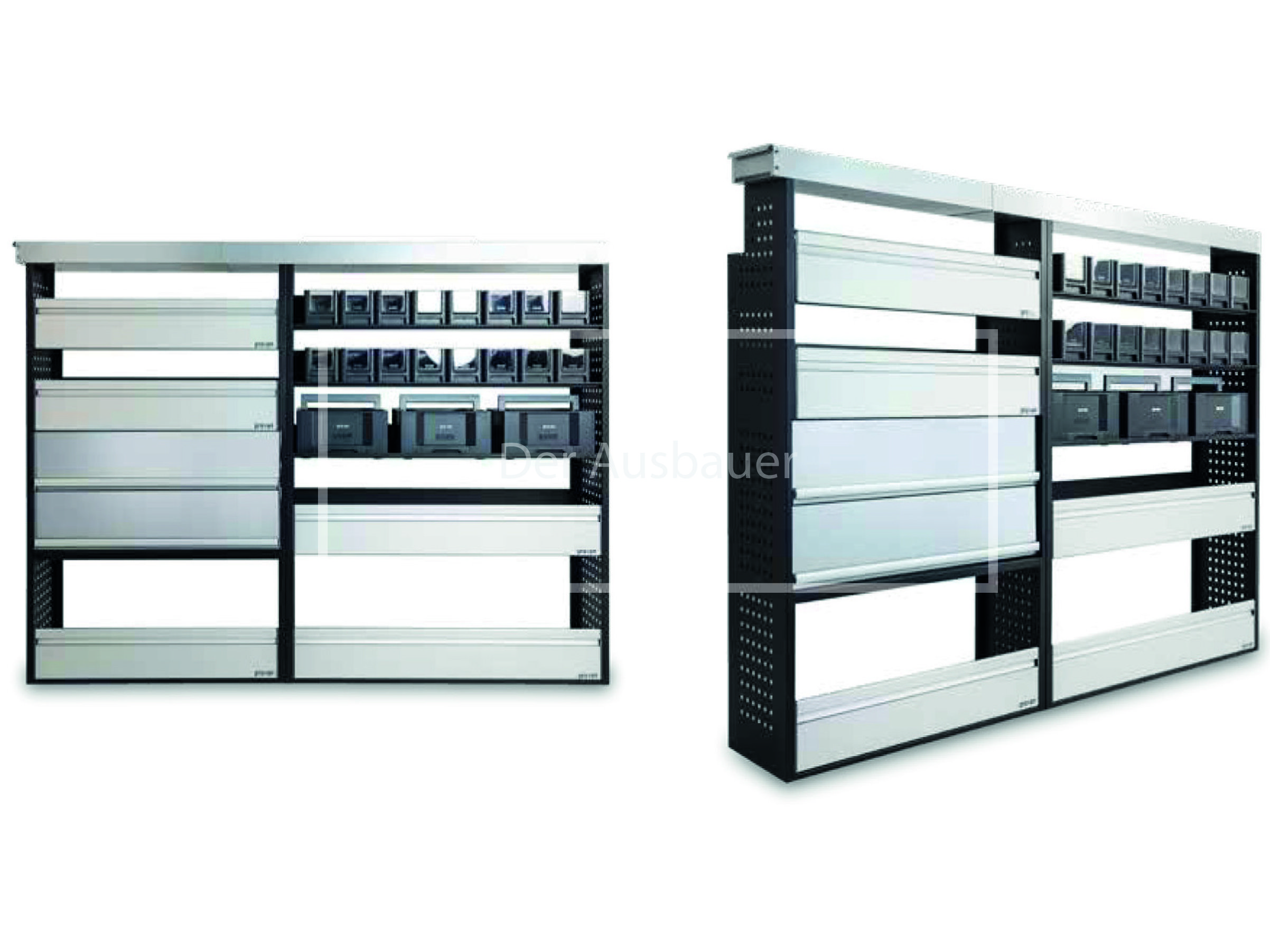 Provan 5 – 14 2502 x 1550 x 380mm 2 x Bodenfach mit Aluklappe, 2 x Schublade, 3 x Fachboden mit Aluklappe, 3 x Koffer groß, 16 x Lagerbox, 1 x Langgutwanne Vormontiert Montagematerial liegt bei           Provan – die Hausmarke vom Ausbauer für Fahrzeugregale in deinem Transporter     Provan bietet hochwertige Fahrzeugregale und Einrichtungen, die speziell für Transporter entwickelt wurden. Unsere Regalsysteme zeichnen sich durch herausragende Qualität und Funktionalität aus und bieten maximale Robustheit sowie eine perfekte Organisation für Ihren Transporter. Die Provan Regale werden fertig vormontiert geliefert und enthalten das passende Montagematerial sowie eine einfache Montageanleitung. Unsere Fahrzeugeinrichtungen bestehen aus einer gewichtsoptimierten Stahlkonstruktion, die Stabilität und Leichtigkeit vereint. Sie sind zudem pulverbeschichtet, um eine lange Lebensdauer zu gewährleisten.   Die Schubladen und Klappen bestehen aus Aluminium und die Kunststoffbehälter und Koffer stammen von dem renommierten deutschen Hersteller Auer Packaging.   Vertrauen Sie auf Provan, um Ihren Transporter effizient auszustatten und höchsten Ansprüchen gerecht zu werden. Eine Fahrzeugeinrichtung für Ihren Transporter                             Citroen Berlingo Fahrzeugeinrichtung, Citroen Jumpy Fahrzeugeinrichtung, Citroen Jumper Fahrzeugeinrichtung, Citroen Nemo Fahrzeugeinrichtung, Dacia Dokker Fahrzeugeinrichtung, Fiat Doblo Cargo Fahrzeugeinrichtung, Fiat Scudo Fahrzeugeinrichtung, Fiat Ducato Fahrzeugeinrichtung, Fiat Fiorino Fahrzeugeinrichtung, Fiat Talento Fahrzeugeinrichtung, Ford Transit Courier Fahrzeugeinrichtung, Ford Connect Fahrzeugeinrichtung, Ford Custom Fahrzeugeinrichtung, Ford Transit Fahrzeugeinrichtung, Iveco Daily Fahrzeugeinrichtung, Hyundai H350 Fahrzeugeinrichtung, MAN TGE Fahrzeugeinrichtung, Mercedes Citan Fahrzeugeinrichtung, Mercedes Vito Fahrzeugeinrichtung, Mercedes Sprinter Fahrzeugeinrichtung, Maxus e-deliver 3 Fahrzeugeinrichtung, Maxus e-deliver 9 Fahrzeugeinrichtung, Maxus EV80 Fahrzeugeinrichtung, Nissan NV200 Fahrzeugeinrichtung, Nissan NV250 Fahrzeugeinrichtung, Nissan NV300 Primastar Fahrzeugeinrichtung, Nissan NV400 Interstar Fahrzeugeinrichtung, Opel Combo Fahrzeugeinrichtung, Opel Vivaro Fahrzeugeinrichtung, Opel Movano Fahrzeugeinrichtung, Peugeot Partner Fahrzeugeinrichtung, Peugeot Expert Fahrzeugeinrichtung, Peugeot Boxer Fahrzeugeinrichtung, Peugeot Bipper Fahrzeugeinrichtung, Renault Kangoo Fahrzeugeinrichtung, Renault Trafic Fahrzeugeinrichtung, Renault Master Fahrzeugeinrichtung, Toyota Proace Fahrzeugeinrichtung, Toyota Proace City Fahrzeugeinrichtung, VW Caddy Cargo Fahrzeugeinrichtung, VW T6.1 Fahrzeugeinrichtung, VW ID Cargo Fahrzeugeinrichtung, VW Crafter Fahrzeugeinrichtung, VW Caddy IV Fahrzeugeinrichtung, VW T6 Fahrzeugeinrichtung, VW T5 Fahrzeugeinrichtung